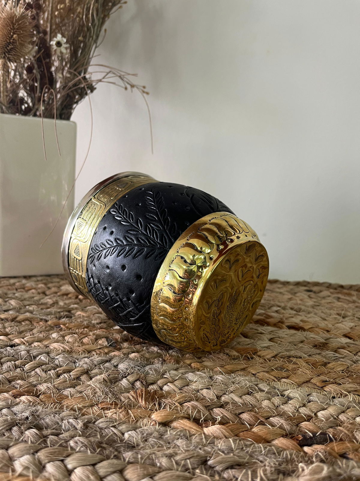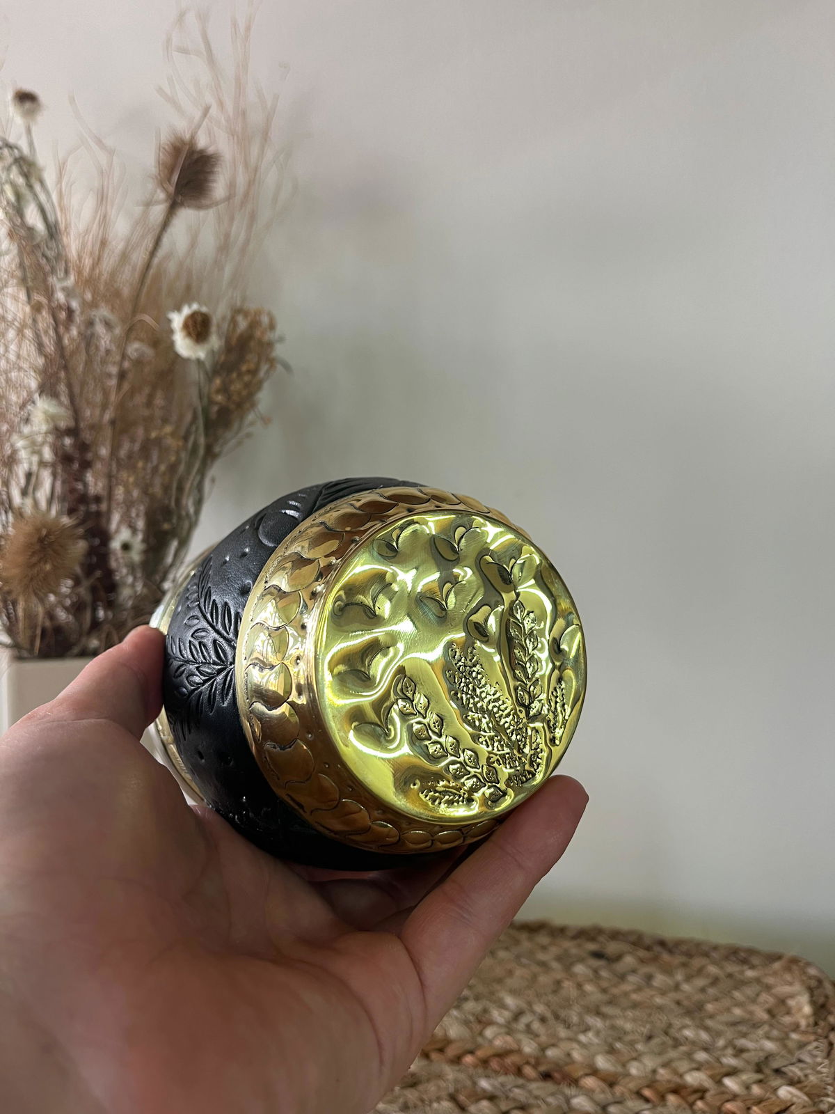 • Forrado en cuero repujado a mano